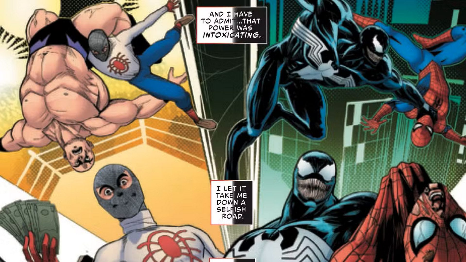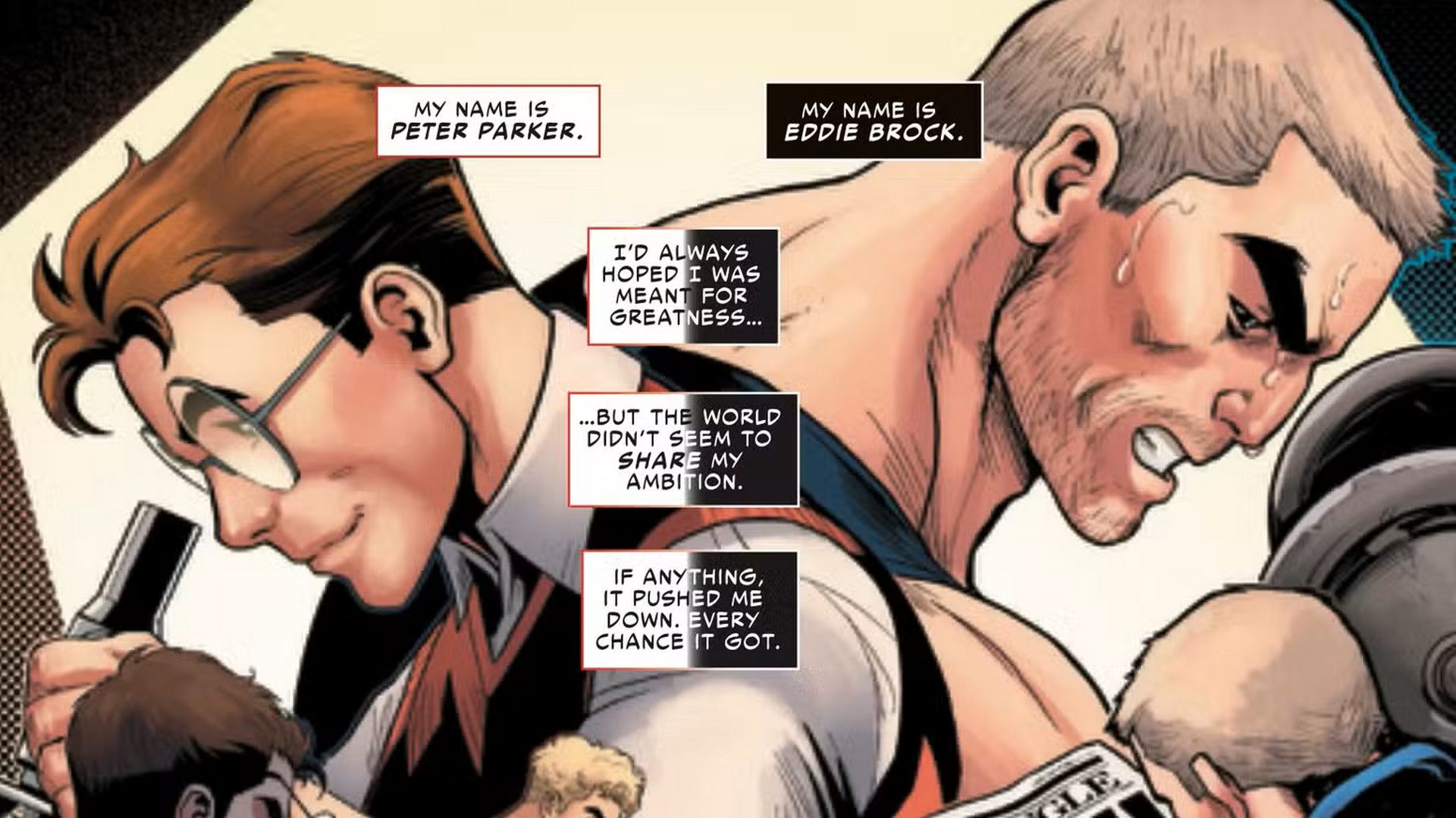 یکی از جذابترین بخشهای این شماره، تطابق دقیق روایت زندگی پیتر پارکر (مرد عنکبوتی) و ادی براک (ونوم) در صفحات ابتدایی کمیک است. روایتهایی که اگرچه از دو جهان متفاوت (Earth-616 و Earth-2250) هستند، اما به طرز حیرتانگیزی مشابهاند؛ هر دو قدرتی فراتر از حد انسانی یافتند، ابتدا در مسیر اشتباه گام برداشتند، اما در نهایت قهرمان شدند.