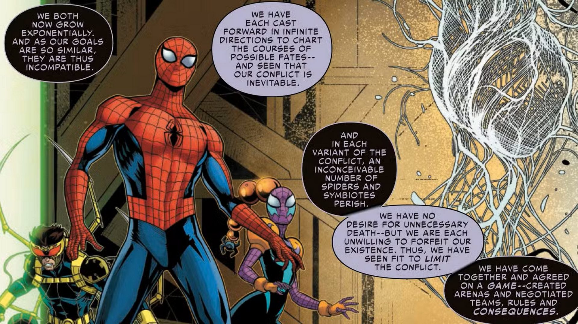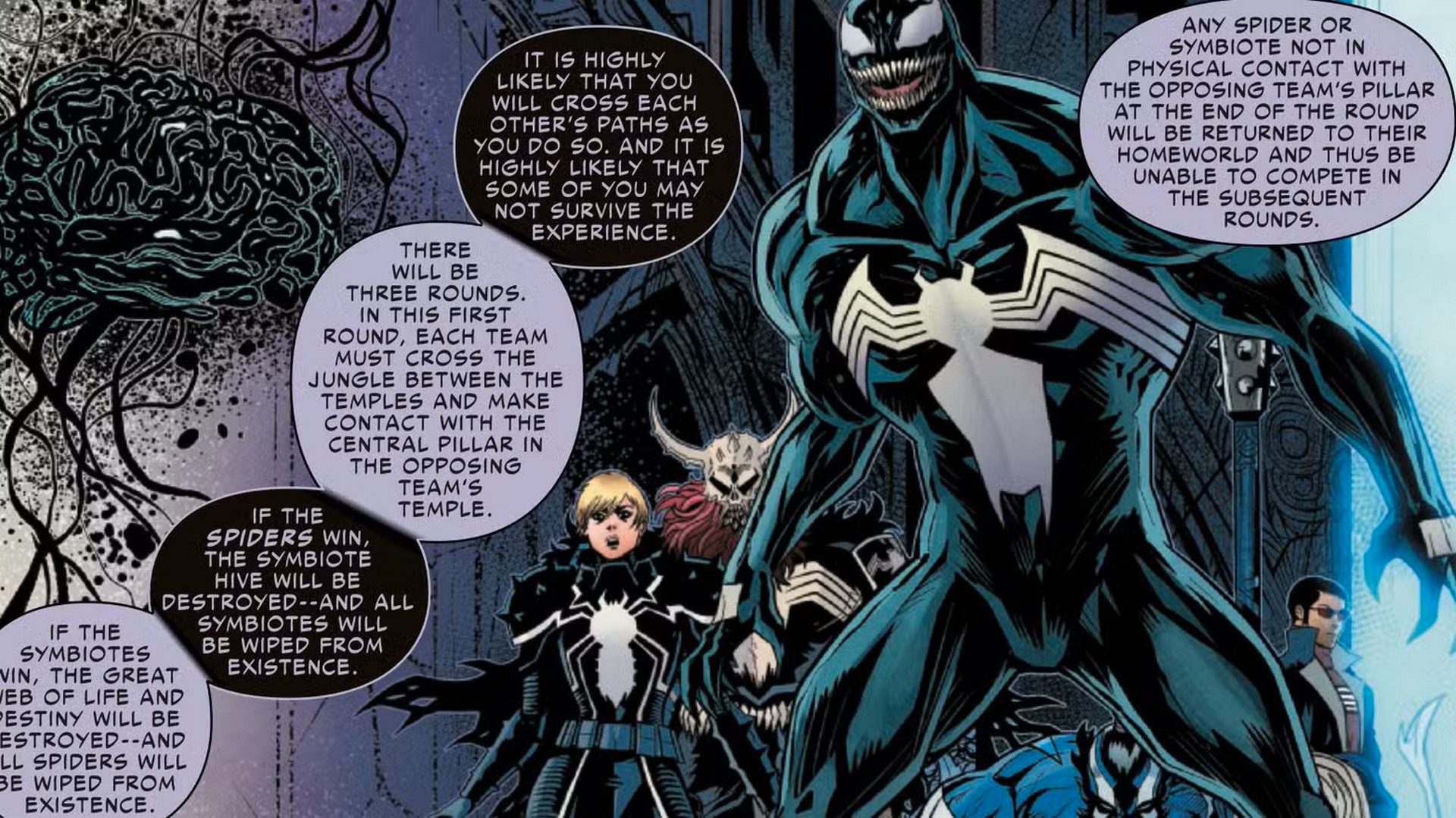 در این داستان، دو نیروی قدرتمند، «قلب تار عنکبوت» که منبع قدرت مردان عنکبوتی در سراسر جهانهای موازی است و «ذهن مشترک سیمبیوتها» که به ونومها نیرو میبخشد، به نقطهای بحرانی رسیدهاند. رشد همزمان و گسترده این دو در مولتیورس، باعث شده تعادل به هم بخورد و فضای کافی برای بقای هر دو وجود نداشته باشد. بنابراین، برای جلوگیری از انقراض، این دو نیرو تصمیم میگیرند که نبرد را به تیمهایی منتخب محدود کنند.