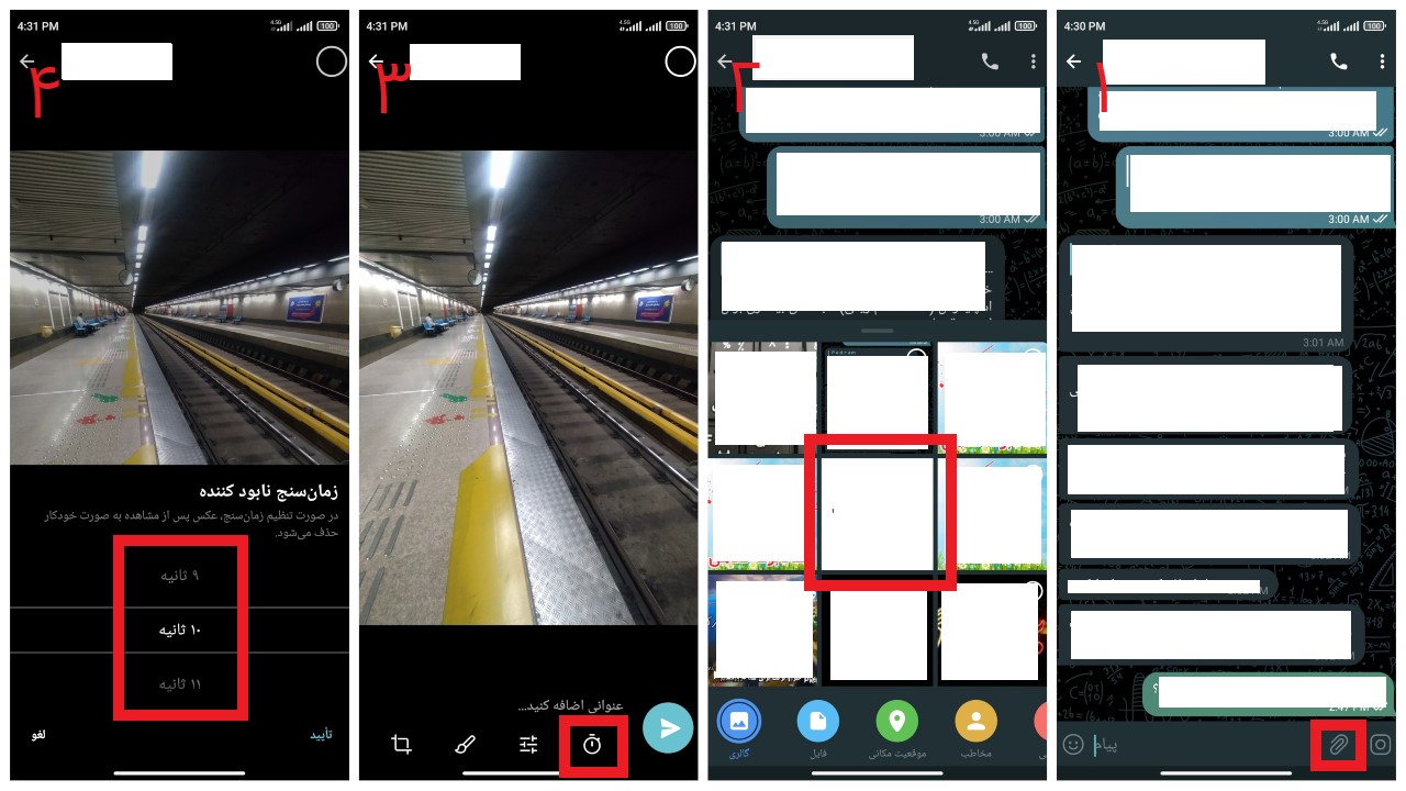 پیام های خود پاک شوندهی تلگرام قبلا نیز در قسمت چت محرمانه وجود داشت، اکنون بعد از بروزرسانی اخیر تلگرام قابلیت ارسال پیامهای زماندار پاک شونده در چتهای معمولی نیز در دسترس است. برای استفاده از این قابلیت قبل از ارسال عکس یا فیلم برای مخاطب خود، نماد کرونومتر (در کنار نماد ویرایش و برش قرار دارد) را انتخاب کنید سپس زمان نمایش فایل خود را تعیین کنید.