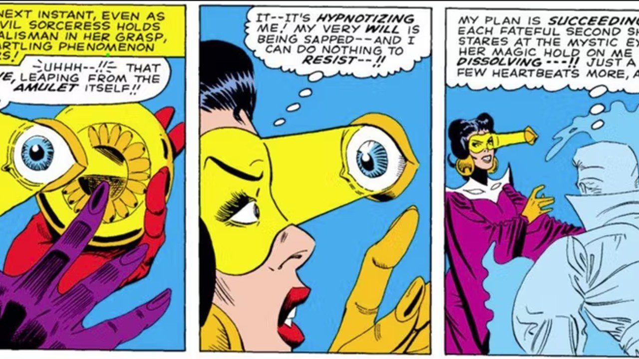 در کمیکها، دکتر استرنج هیپنوتیزم کردن را از مربی خود (Ancient One) آموخت. اگرچه او در این کار خوب بود، اما هنوز محدودیتهایی برای توانایی او وجود داشت. این امر بهویژه هنگام مقابله با دشمنی با تواناییهای جادویی صادق بود اما خوشبختانه به مرور زمان توانست بر آن تسلط پیدا کند. در دنیای سینمایی مارول، چشم آگاموتو (Eye of Agamotto) فقط بهعنوان یک محفظه برای سنگ زمان (یکی از شش سنگ ابدیت) استفاده شد در حالی که در کمیکها، تواناییهای جادویی بسیار زیادی دارد که یکی از مهمترین آنها تقویت تواناییهای هیپنوتیزم دکتر استرنج است.