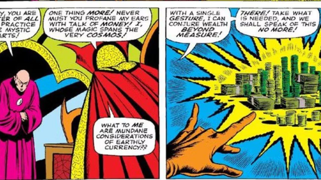 در کمیکها، دکتر استرنج این توانایی را دارد که با جادو هر چیزی که به ذهنش خطور میکند را خلق کند. جای شکی نیست که اگر کسی چنین قدرتی داشت، از آن برای خلق پول استفاده میکرد. دکتر استرنج هم از این قاعده مستثنا نیست زیرا در کمیکها به کررات به چنین کاری دست زده است. یادتان میآید که در سکانس آغازین فیلم Avengers: Infinity War، وانگ پول کافی برای غذا خریدن نداشت؟ اگر نویسنده به او اجازه میداد، استرنج میتوانست سفره مفصلی برای دوست صمیمی خود پهن کند.