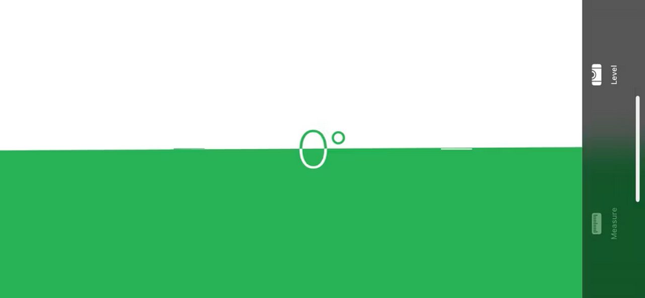 اپلیکیشن Measure یک قابلیت دیگر هم دارد: توانایی اندازهگیری زوایا و عمل به عنوان تراز دیجیتال. برای استفاده از این ویژگی، ابتدا اپلیکیشن Measure را اجرا و روی تب «Level» کلیک کنید. سپس آیفون خود را روی یک سطح قرار دهید تا زاویه اندازهگیری شود. در زاویه 0 درجه (سطح)، نشانگر سطح سیاه به رنگ سبز تبدیل خواهد شد.