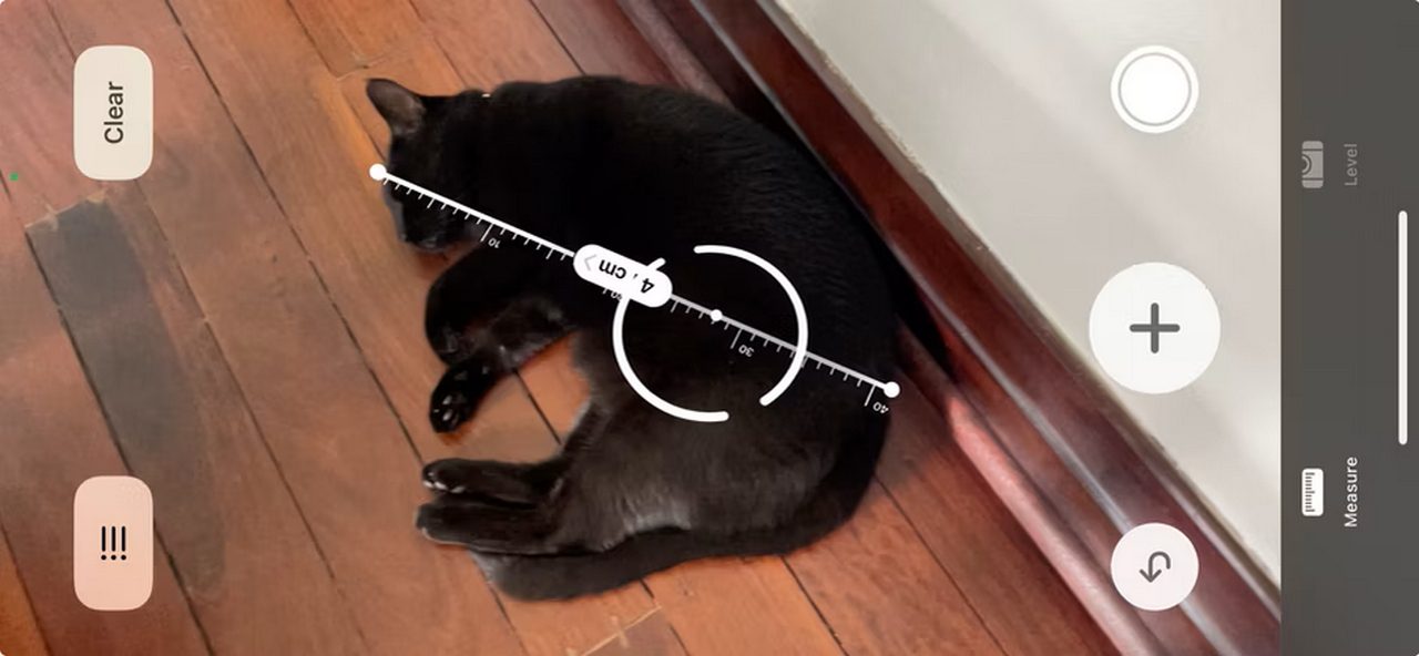 این برنامه با استفاده از واقعیت افزوده (AR) عمل میکند، جایی که اندازهگیری به صورت لایهبرداری شده در دوربین نمایش داده میشود. تنها کاری که باید انجام دهید این است که نقاط ابتدایی و انتهایی یک جسم را مشخص کنید و سپس با فشردن کلید شاتر، از آن سوژه عکس بگیرید. این برنامه به طور کلی دقت خوبی دارد اما باز هم به اندازهی متر میلیمتری عمل نمیکند و باید این موضوع را هم مد نظر داشته باشید. در واقع برای رسیدن به یک نتیجهی کلی دربارهی فاصلهی دو نقطه، این قابلیت آیفون بسیار کاربردی است.