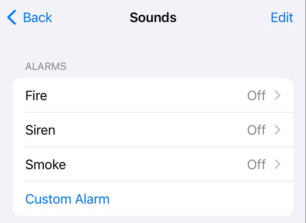 از اینجا، روی «صداها» (Sounds) ضربه بزنید تا اعلانها را تنظیم کنید. آیفون از پیش اینگونه آموزش دیده که برخی از متداولترین صداها مانند آژیرهای حریق، پارس کردن سگ و سایر آژیرهای وسایل اورژانس را تشخیص دهد. میتوانید روی «آلارم سفارشی» (Custom Alarm) ضربه بزنید تا صداهای خاص خود را به لیست اضافه کنید.