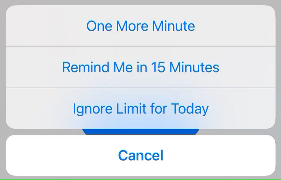 وقتی به محدودیت زمانی خود برسید، یک اعلان ظاهر شده و اپلیکیشن شبکهی اجتماعی مورد نظر به طور موقت «مسدود» میشود. از اینجا میتوانید تصمیم بگیرید که استفاده از آن را متوقف کنید، محدودیت زمانی اپلیکیشن را یک دقیقه (یا ۱۵ دقیقه) به تعویق بیاندازید، یا محدودیت زمانی را برای امروز نادیده بگیرید و به طور کلی آن را بردارید.
