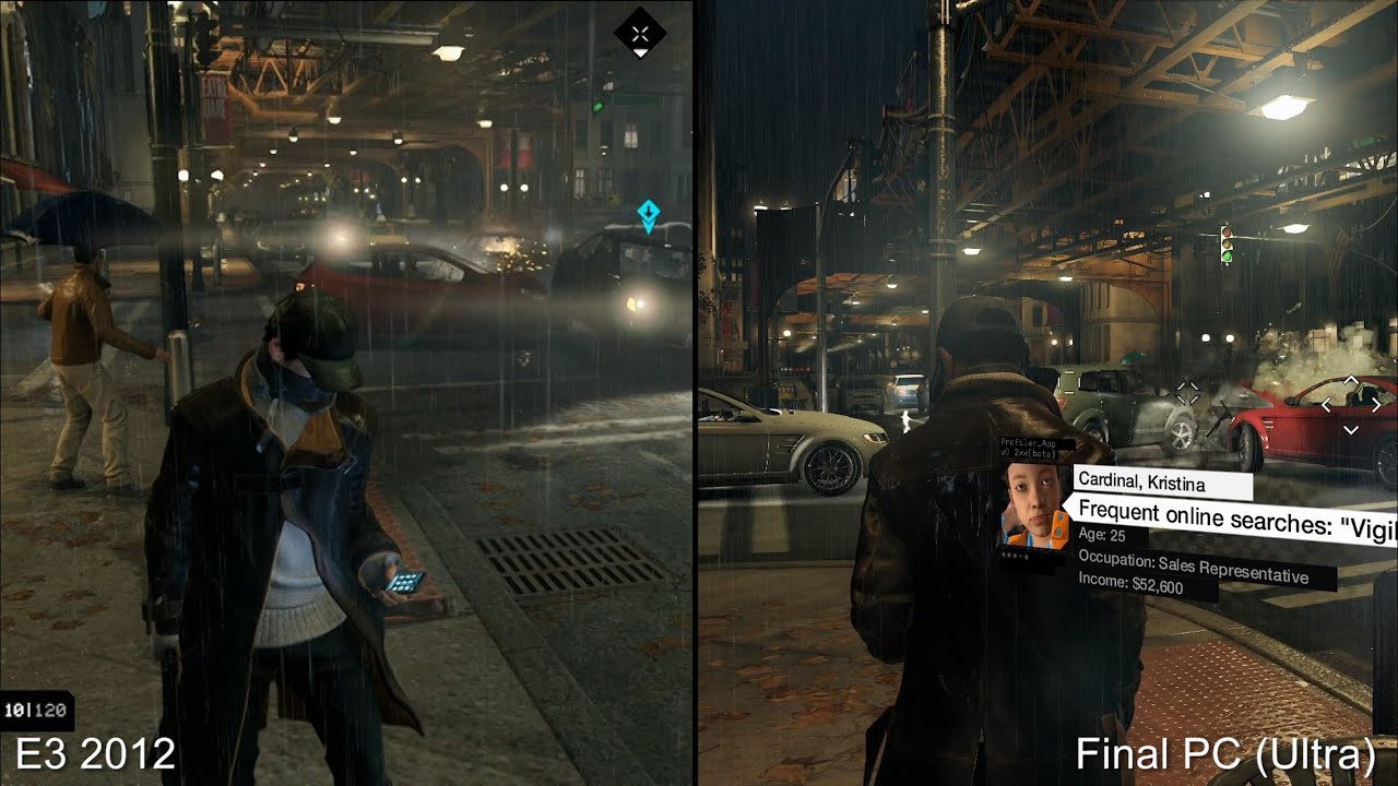 مراسم E3 همیشه نمایشهای فوقالعادهای برای ما به همراه داشته و نمایش بازی Watch Dogs در سال ۲۰۱۲ یکی از شگفت انگیزترین آنهاست که نسل هشتم را برای ما بسیار چشم نواز جلوه داد. تریلر به نمایش درآمده در این مراسم تکسچرهای فوقالعاده با کیفیتی را در کنار حالات چهره بی نظیر نشان داد که توجه هر گیمری را به خود جلب کرد و این بازی را یکی از مورد انتظارترین بازیهای سالهای ابتدایی نسل هشتم ساخت. متاسفانه این مورد تفاوت چندانی با مورد پیشین نداشت و محصول نهایی آن چنان ضعیفتر از تریلر این بازی بود که حتی قویترین پیسیهای آن سالها توان ارائه گرافیکی در سطح تریلر این بازی را نداشتند!