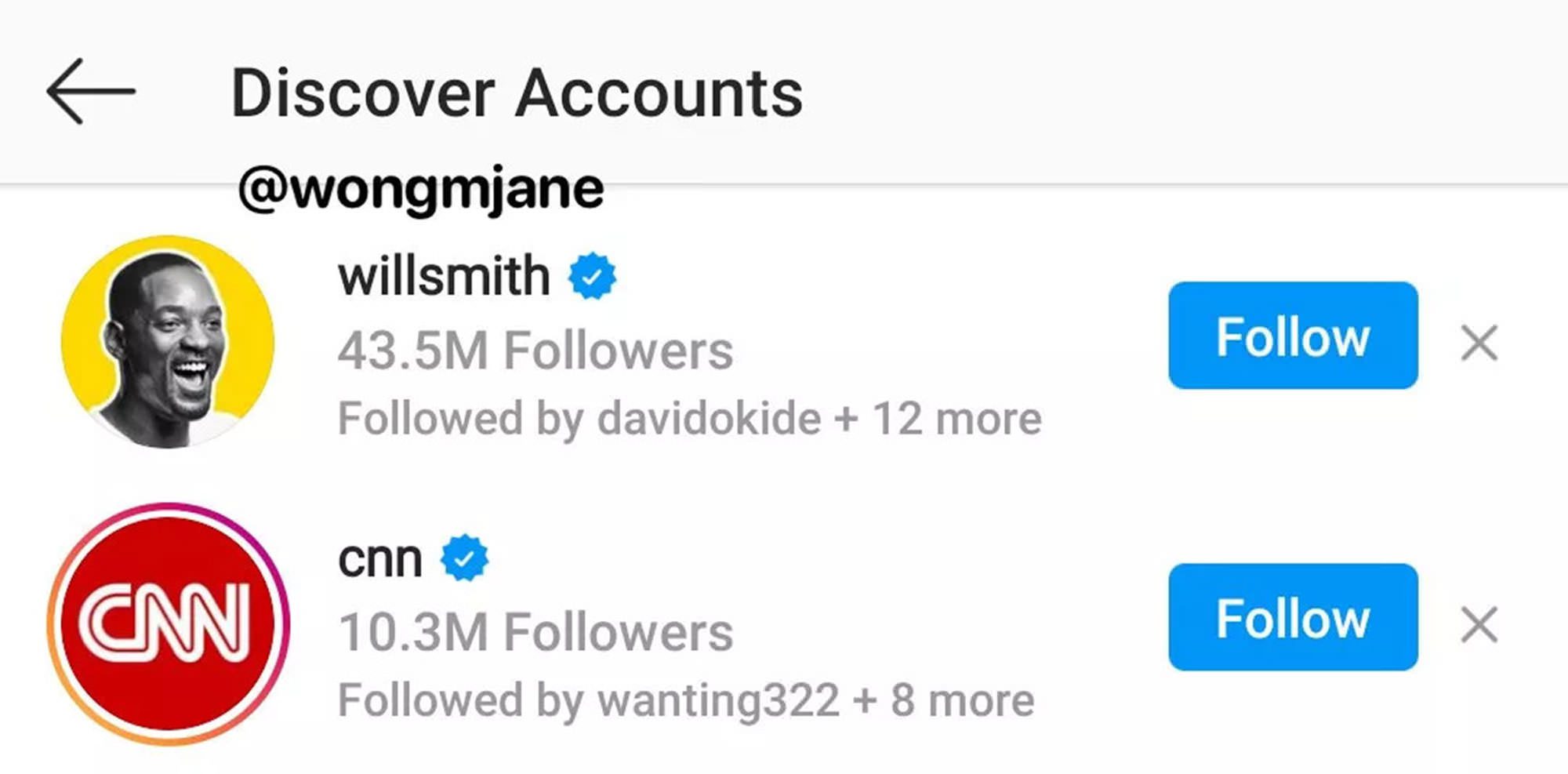 قطعا پیشتر با ویژگی Discover People آشنا بوده و احتمالا از آن برای پیدا کردن دوستان یا سلبریتیها و اینفلوئنسرها استفاده کرده باشید. احتمالا با افزوده شدن قابلیت تازه «Discover Accounts» این دو بخش از یکدیگر جدا شده و Discover Accounts به محلی برای پیدا کردن سلبریتیها و چهرههای مشهور اختصاص داده شود، در حالی که Discover People همچنان محلی برای پیدا کردن دوستان و آشنایان باقی خواهد ماند.