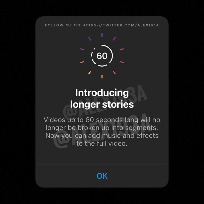 طبق توییتی که کاربر توییتر با نام کاربری alex193a منتشر کرده است، اینستاگرام استوریهای ۶۰ ثانیهای را تقسیم نخواهد کرد.