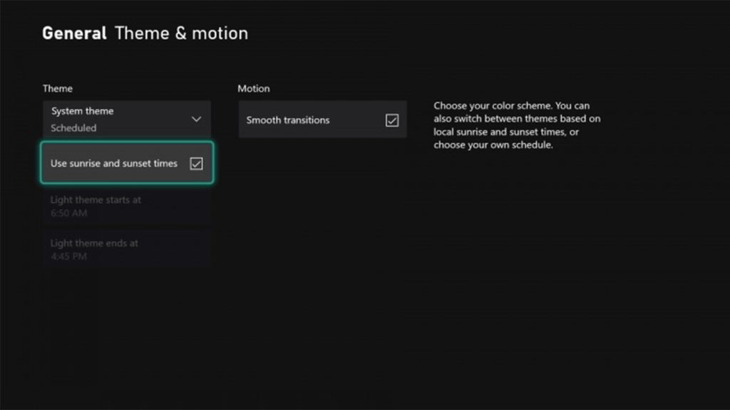 برای فعالسازی این قابلیت، وارد داشبورد صفحه اصلی ایکسباکس شوید. سپس دکمه Select کنترلر خود را فشار دهید. این کار صفحه تنظیمات شخصیسازی (Customize Home) را برای شما باز میکند. در این بخش میتوانید مواردی مانند تصویر پسزمینه، قالب رنگی و ترتیب موارد موجود در صفحه اصلی را تغییر دهید. گزینه Theme & Motion را انتخاب کنید و در بخش System Theme روی گزینه Scheduled کلیک کنید و تیک حالت use sunrise and sunset times را بزنید. به همین راحتی! حالا میتوانید از چشمان خود در برابر نور آبی اضافه در تاریکی شب محافظت کنید.