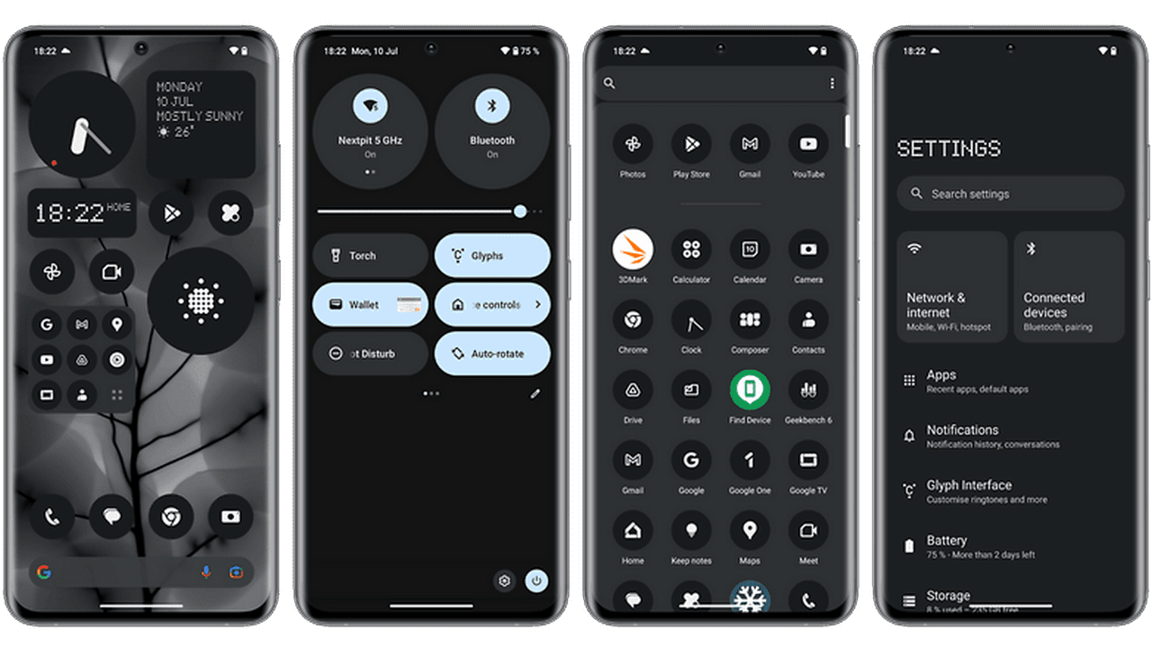 Nothing OS، با طراحی بصری منحصر به فرد و استفاده زیاد از رنگهای تکرنگ و افکتهای ماتریسی، به یکی از رابطهای کاربری برجسته تبدیل شده است. این طراحی به همراه گزینههای سفارشیسازی فراوان و نورپردازی Glyph در گوشیهای Nothing، تجربهای تازه و جذاب را ارائه میدهد. به علاوه، کمبود نرمافزارهای بیزینسی و پیشنصب شده در این رابط کاربری، آن را از بسیاری از رقبای خود متمایز میکند.