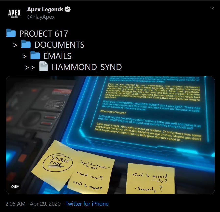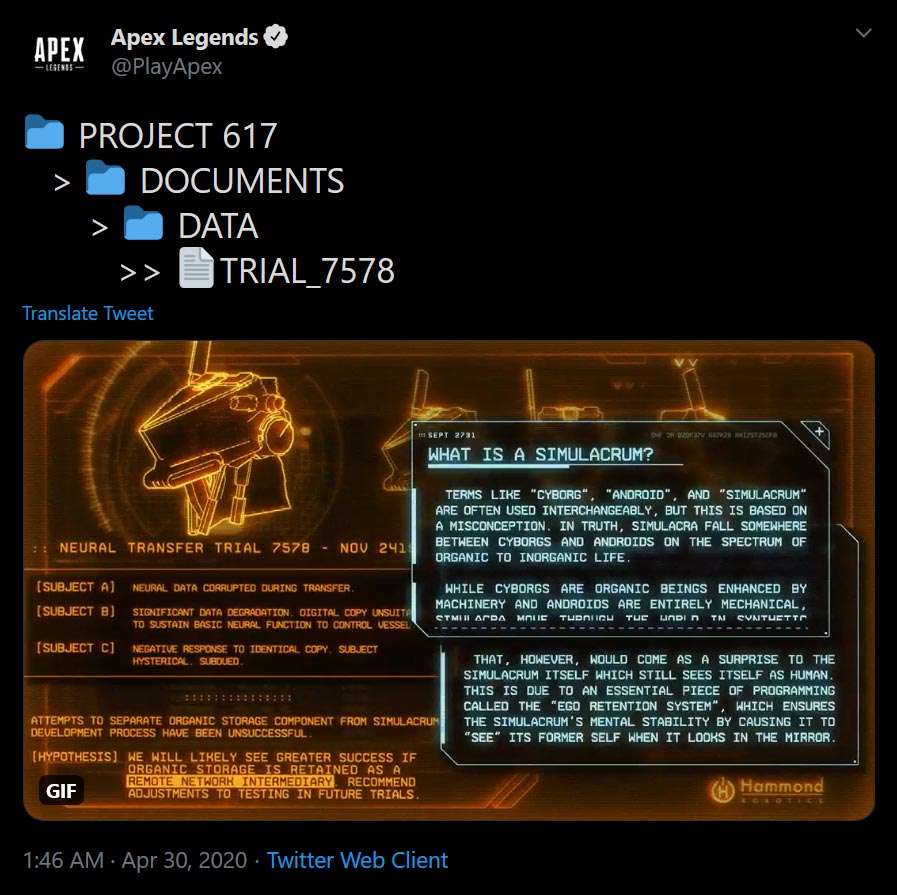 اما محتوای این تیزرها چیست؟ در صورتی که متون موجود در تصویر اول را با دقت بخوانید، متوجه میشوید که به Revenant آخرین لجند اضافه شده به بازی ارتباط دارند. این شخصیت در دنیای فرنچایز تایتانفال (که Apex Legends هم جزو آن است) یک قاتل حرفهای کمنظیر محسوب میشد، اما شرکت Hammond Robotics با جایگزین کردن اکثر اعضای بدنش، او را به یک روبات و ماشین کشتار جاودان تبدیل کرد. در این بین اما برنامهریزیهای او با مشکل روبرو شد و در نتیجه، خاطرات گذشتهی خود را به یاد آورد و فهمید که چه بلایی به سر او آوردهاند. حالا او به دنبال گرفتن انتقام خود از Hammond Robotics و مسببان این کار است.