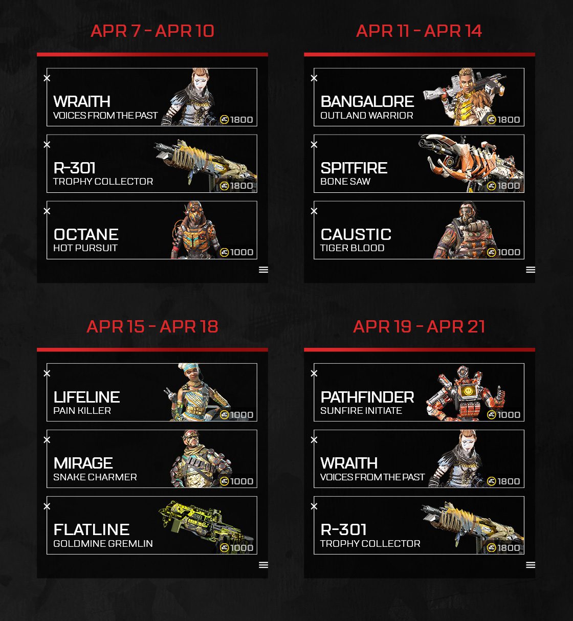 البته آیتمها به همینجا ختم نمیشوند؛ اسکینهای ویژهی این رویداد برای لجندها و اسلحه به صورت جداگانه با واحد پول درون بازی و یا داشتن بتل پس قابل دسترسی هستند. گل سرسبد این اسکینها Young Blood مخصوص بلادهاند است که در انیمیشن مخصوص او آن را میبینیم. هر سری از آیتمها در روزهای خاصی قابل خریداری هستند که زمانشان در تصویر زیر قابل مشاهده است.