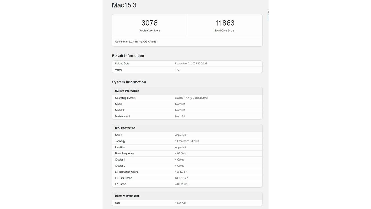 هنوز اطلاعات زیادی از M3 پرو و مکس در اختیار نداریم اما اگر نسل M2 را مبنای مقایسه قرار دهیم، باید بگوییم تراشههای جدید اپل احتمالا در بخش تک هستهای تفاوت معناداری در مقایسه با اسنپدراگون X الیت نخواهند داشت. شما میتوانید در زیر، نتیجهی بنچمارک گیکبنچ M3 اپل را مشاهده کنید.