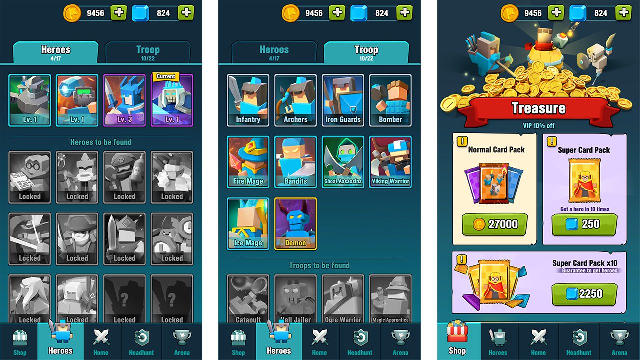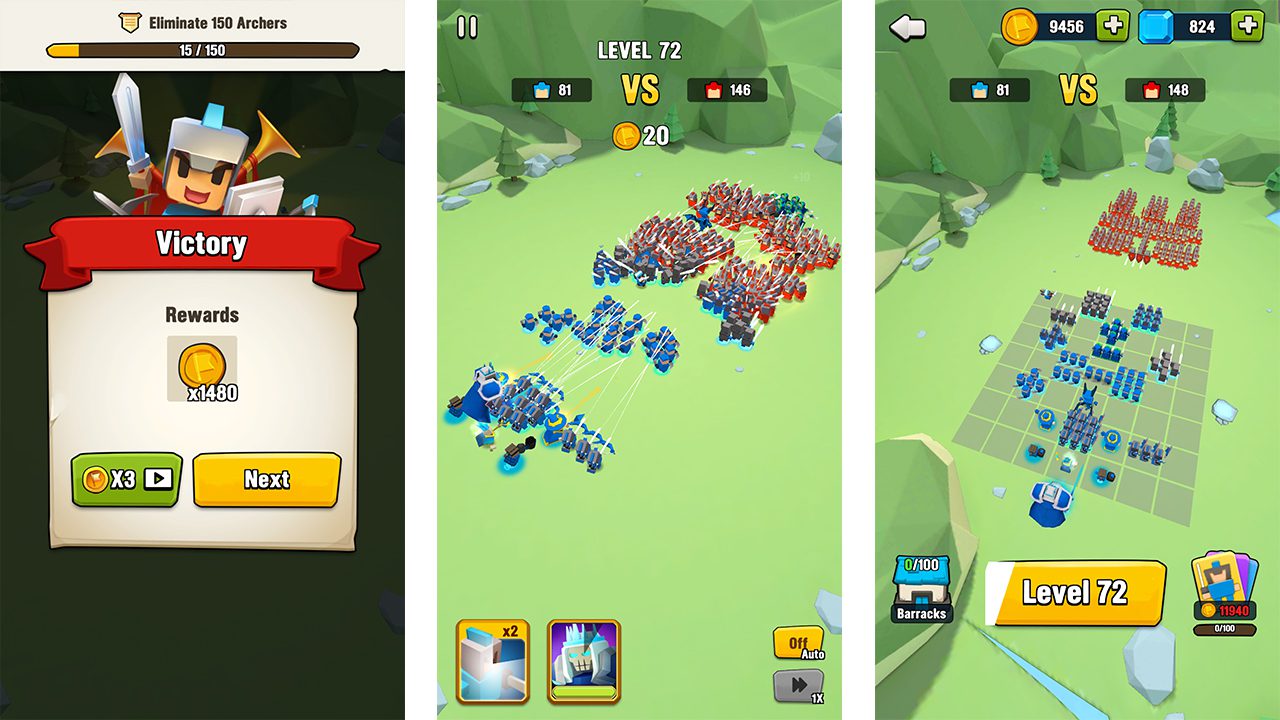 ارتشتان را در خانههای مربعی جای دهید و حمله کنید! هر تیمی که زودتر تمام سربازهای حریف را بکشد، پیروز میدان است. در پایان هر مرحله، تعدادی سکه بهعنوان غنیمت جنگی دریافت میکنید که اگر بخواهید، میتوانید با دیدن یک ویدیو تبلیغاتی با زمان زیر یک دقیقه، میزان آن را سه برابر کنید و زودتر به اهدافتان برسید. همچنین در بخش فروشگاه بازی Art of War: Legions بخشهایی وجود دارد که با دیدن ویدیوهای تبلیغاتی میتوانید سکه، الماس یا کارت رایگان دریافت کنید و روند رشد را سرعت بخشید.