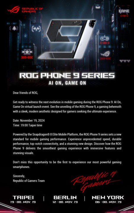 ایسوس اعلام کرده که گوشیهای گیمینگ ROG Phone 9 خود را با پردازنده قدرتمند اسنپدراگون ۸ الیت در تاریخ ۱۹ نوامبر رونمایی خواهد کرد. این رویداد اختصاصی از ساعت ۱۲ ظهر به وقت اروپای مرکزی (CET) آغاز میشود و شاهد معرفی راگ فون ۹ و ROG Phone 9 Pro در آن خواهیم بود.
