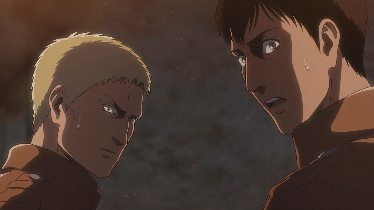 پس از فرار از قلعه، تمامی سربازان روی دیوار میروند تا آنجا مدت کوتاهی استراحت کرده و سپس یمیر را برای معالجه به تروست ببرند. قبل از شروع حرکت، راینر مکالمهی کوتاهی را با ارن شروع کرده و در آن فاش میکند او و برتولت به ترتیب تایتان زرهپوش و تایتان عظیمالجثه هستند. با گفتن چنین جملاتی، داستان به گذشته رفته و زمانی را نشان میدهد که ساشا نامه را برای هانجی برده بود. در آن زمان فاش میشود که آنی، راینر و برتولت از یک منطقه میآیند. با این حال، هیچ اطلاعاتی از آنها موجود نیست. سربازان سپس به این نتیجه میرسند که این دو احتمالا محل قرار گیری ارن را برای آنی فاش کردند؛ زیرا آن دو فکر میکردند ارن در بخش راست آرایش مخصوص نظامی قرار دارد. در نتیجه، از همگی میخواهند مراقب راینر و ربتولت باشند اما اقدامی نکنند که شکشان برانگیخته شود. داستان سپس به زمان حال آمده و ادامهی گفتگو را نشان میدهد.