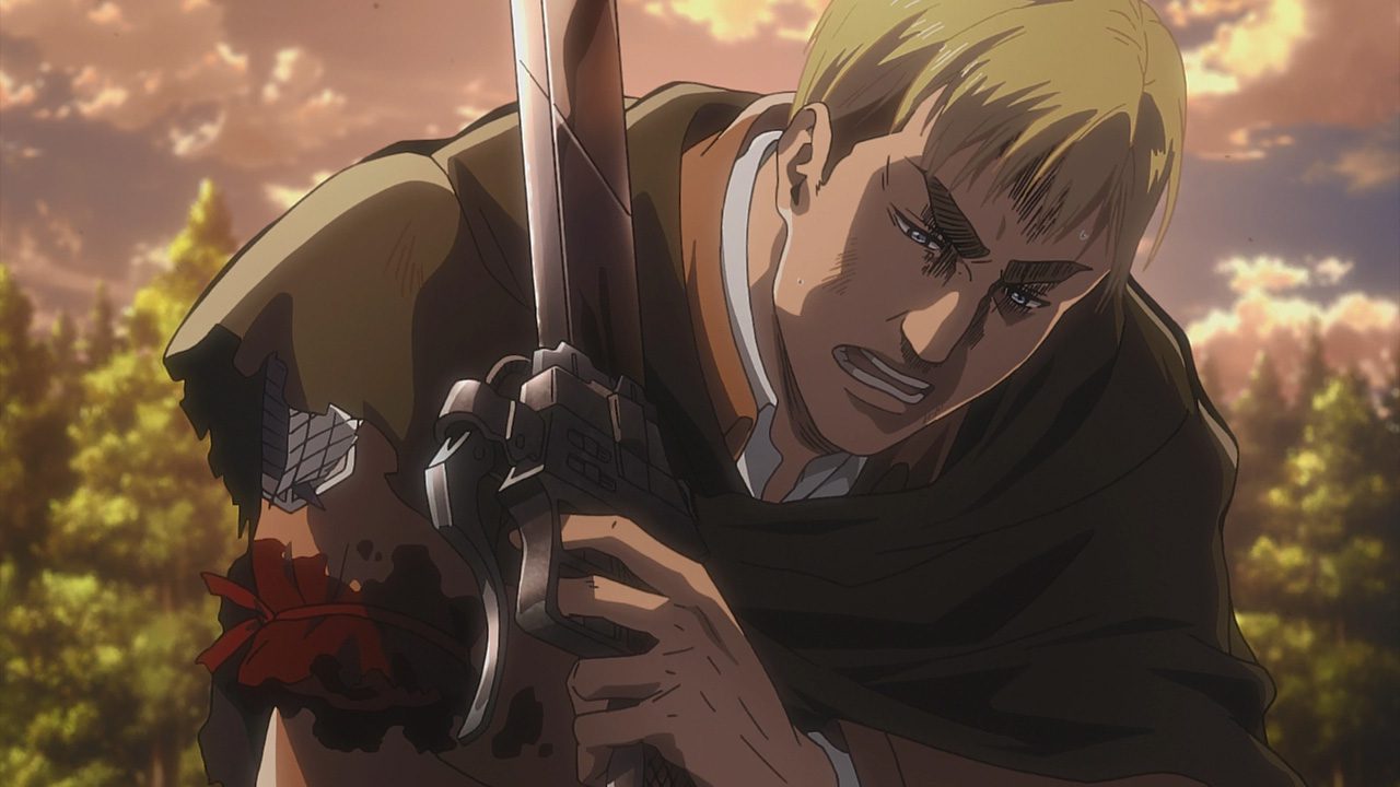 با پیچیده شدن اوضاع، آرمین، اروین و میکاسا ارن را از شر برتولت و کانی و ساشا هم کریستا را از شر یمیر نجات میدهند. آنها سپس تصمیم به فرار میگیرند که تایتان زرهپوش شروع به پرتاب کردن تایتانهای کوچک میکند تا جلوی آنها را بگیرد. ارن و میکاسا در اثر برخورد یکی از همین تایتانهای کوچک به زمین در فاصلهی نزدیک از روی اسب به زمین میافتند. ارن به محض بلند شدن از روی زمین با تایتانی مواجه میشود که مادرش را خورده بود. ارن سعی میکند به تایتان تبدیل شده و انتقام بگیرد اما تلاشهایش نتیجهای ندارند.