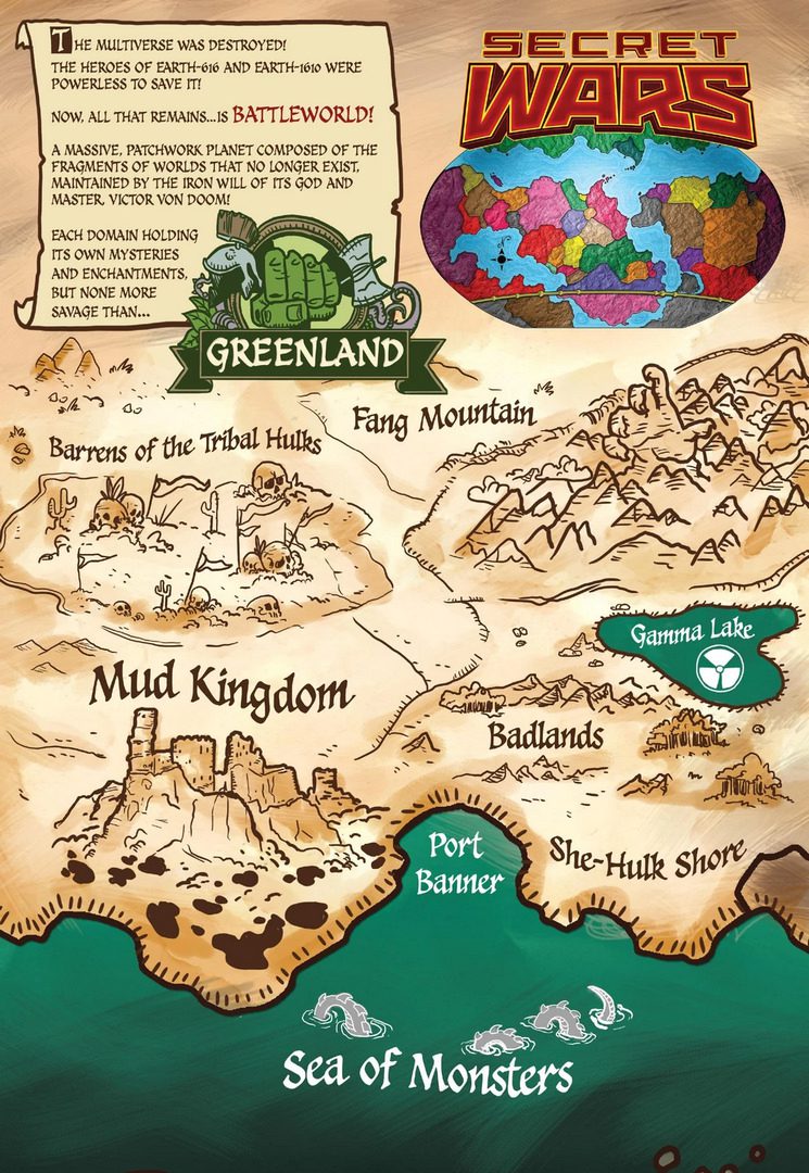 در دنیای کمیکهای Secret Wars، سرزمین Greenland بزرگترین قلمرو Battleworld محسوب میشود که توسط Red King، نسخهای از Red Hulk، اداره میشود. این سرزمین زمانی آرام بود، اما پس از حمله A.I.M. و بمبارانهای گامایی، به بیابانی مملو از هیولاهای جهشیافته تبدیل شد. در این میان، شخصیتی به نام Maestro که احتمالا به زودی در MCU معرفی میشود، یکی از واریانتهای هالک در این سرزمین است.