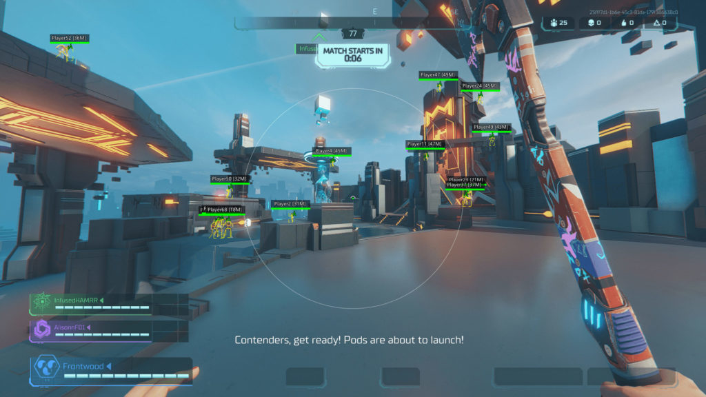 بعد از انتخاب ظاهر کاراکتر و اتمام کار، وارد هاب مرکزی بازی میشوید؛ محیطی شبیه به Creative Hub فورتنایت که میتوانید در آن آزادانه حرکت کرده و از طریق پورتالهایی نورانی، به بخشهای مختلف منو دسترسی داشته باشید. بزرگترین پورتال مستقیم شما را وارد بازی میکند. اول حالت بازی مدنظر که فعلا تکنفره، تیمی سهنفره و مودی به نام Faction Wars است را انتخاب کرده و به لابی انتظار منتقل میشوید. این لابی چیزی شبیه به همان هاب مرکزی است، فقط سکوها و سازههای بیشتری دارد که تا زمان اتمام مچمیکینگ میتوانید همراه با سایر بازیکنان کمی در آن گرگم به هوا بازی کنید و این طرف و آن طرف بپرید. اولین مشکلی که با هایپر اسکیپ پیدا کردم همینجا بود: مچمیکینگ بازی واقعا طول میکشد. شاید این مسئله بهخاطر تعداد نسبتا کم بازیکنان باشد، چرا که طی پنج دست اولی که در حالت سولو بازی کردم، تعداد کل بازیکنان از ۴۰ نفر فراتر نرفت (حداکثر ۹۹ بازیکن میتوانند در هر مسابقه شرکت کنند). به طور کلی، تعداد بازیکنان به نظر در حال حاضر چندان زیاد نیست و دفعاتی که با بیش از ۸۰ نفر وارد نقشه شدم، کمتر از تعداد انگشتان یک دست بود.