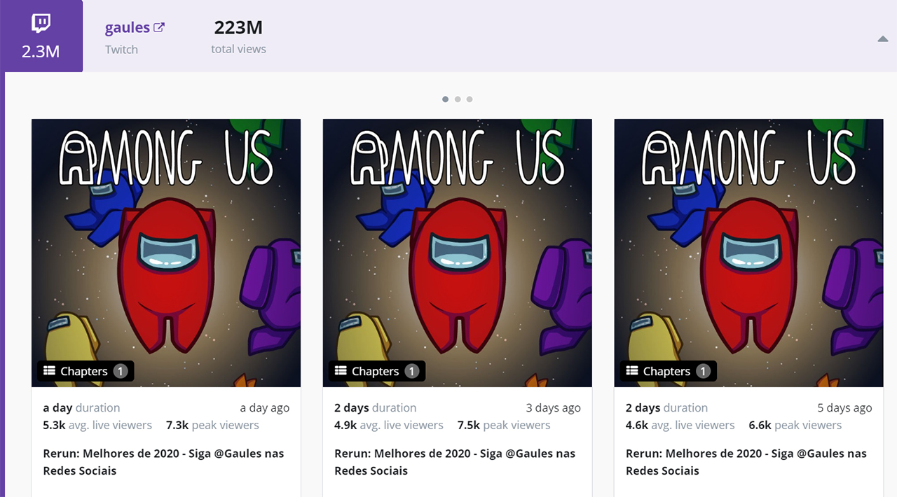 Gaules که همچنین تحت عنوان Alexndre ‘Gaules’ Borba نیز شناخته میشود، اصالتا اهل برزیل است و جامعهی مخاطبین او به سرعت درحال پیشرفت و افزایش است. او در ماه نوامبر سال ۲۰۲۰ به عنوان پربینندهترین استریمر ماه با ۱۶.۲ میلیون ساعت تماشا در توییچ شناخته شد و این اتفاق نقطه عطف مهمی در کارنامهی فعالیتهای او محسوب میشود. Gaules در توییچ همواره به عنوان پربینندهترین کانال پرتقالیزبان شناخته میشود و بین همزبانان خود شهرت بسیار زیادی دارد. او در ماههای اخیر اغلب بازی Among Us را استریم میکند و همچنین عملکرد خوبی در زمینهی جذب اسپانسرینگ و همکاری با کمپانیهای مختلف از خود نشان داده است.
