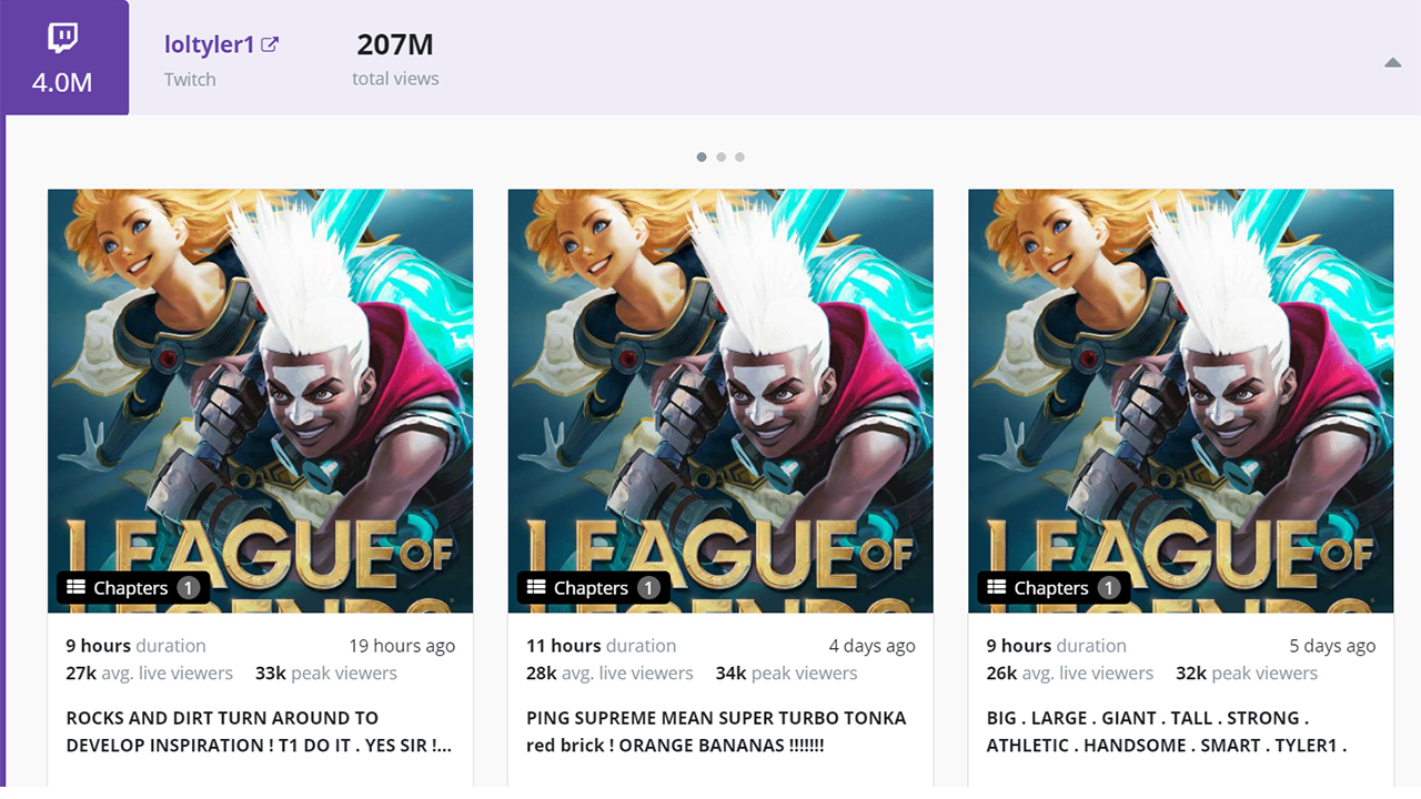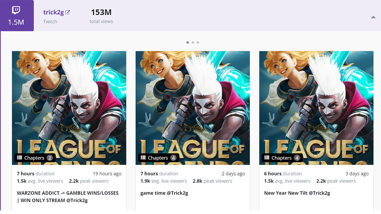 Trick2g یکی از قدیمیترین پلیرهای حرفهای بازی League of Legends است و تنها از طریق همین بازی به بازدید ۱۵۳ میلیونی دست یافته است. این استریمر آمریکایی در مقایسه با دیگر اینفلوئنسرهای همرده و همسبک و سیاق خودش، اغلب به عنوان یک اینفلوئنسر درجه یک با استعداد بالا در زمینهی جذب اسپانسر و همکاریهای تجاری با برندهای معروف شناخته میشود. مخاطبین و هواداران او همچنین میتوانند از طریق کانال یوتوب آن محتواهای بیشتری را از Trick2g مشاهده کنند.