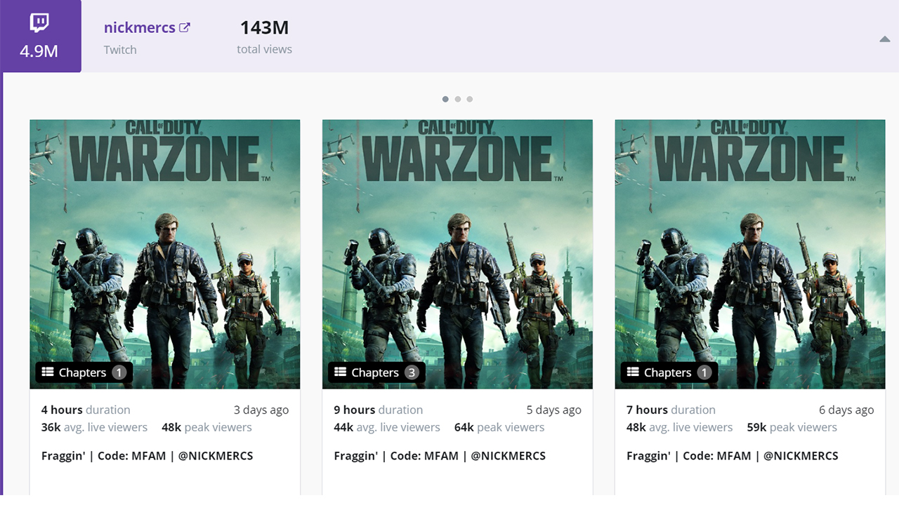NickMercs به عنوان یک بدنساز حرفهای در توییچ استریم میکند و طرفداران بسیار زیادی هم دارد. او یک بازیکن حرفهای در مسابقات الکترونیک است و به عنوان عضوی از گروه معروف FaZe Clan شناخته میشود. کانال توییچ NickMercs بیش از ۱۴۳ میلیون بازدید کسب کرده و همچنین در یوتوب نیز ۳.۴ میلیون دنبالکننده دارد. این استریمر معروف اغلب درحال تجربهی بازیهایی مثل فورتنایت و Call of Duty دیده میشود.