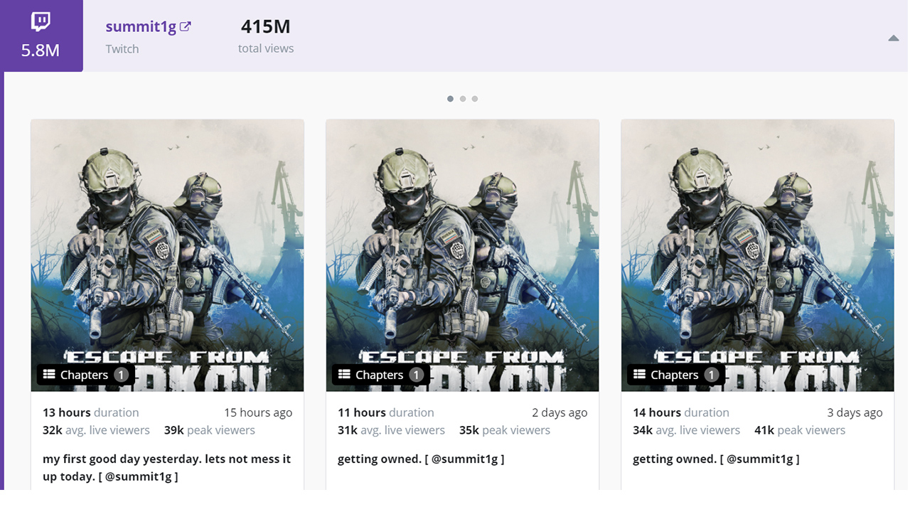 Summit1g یک پلیر سابق Counter-Strike: GO است که به عنوان یک استریمر نیمهحرفهای اهل ایالات متحده، پیش از اینکه استریمرهای معروفی مثل نینجا، Shroud، TFUE و Myth او را کنار بزنند، بزرگترین استریمر توییچ شناخته میشد. سامیت در اغلب روزهای هفته فورتنایت استریم میکند و پیش از اینکه بازی Counter-Strike: GO را کنار بگذارد، توسط برندهای معروفی مثل Monster و Audio-Technica تحت اسپانسرینگ قرار میگرفت. سامیت علاوه بر کانال توییچ بسیار معروفش که بازدیدی ۴۱۵ میلیونی دارد، در شبکههای مجازی مختلف نیز حضور چشمگیری را از خود نشان داده و دارندهی یک کانال یوتوبی با بیش از ۶۷۶ هزار دنبالکننده است.