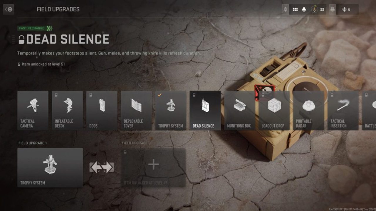 قبل از اینکه به سراغ دد سایلنس برویم، بهتر است با آن آشنا شویم. اکتیویژن در Call of Duty: Modern Warfare 2019 از آیتمهای جدیدی با نام Field Upgrades رونمایی کرد که بسته به نوعشان، مزیت متفاوتی را ارائه میدهند. یکی از جدیدترین فیلد آپگریدها Dead Silence نام داشته و برای نخستین بار در Call of Duty: Modern Warfare 2 معرفی شده است. البته تعدادی از کاربران معتقد هستند دد سایلنس باید به عنوان یک پرک (Perk) دسته بندی شود.