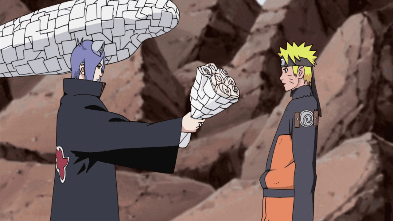 این قسمت یکی از احساسی و بهترین سکانس های انیمه ناروتو را به وجود میآورد. پس از پیروزی ناروتو، اعضای دهکده کونوها گرد او جمع میشوند و همزمان با جشن پیروزی خود، ناروتو را قهرمان مهربان دهکده برگ خطاب میکنند. در حالی که کونان (Konan) دوست صمیمی پین بود، مجذوب شخصیت ناروتو شده و به او تبریک میگوید، که این موضوع سکانس ناراحت کنند و در عین حال زیبایی را به وجود میآورد.