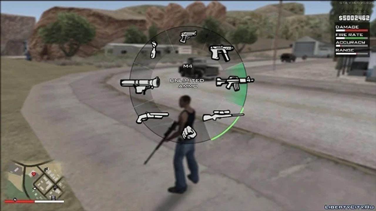 پس از نصب این مد در بازی GTA SA، شما صفحه تعویض تفنگی دقیقا مشابه بازی GTA V دریافت میکنید. علاوه بر آن، منوی بازی به شیوه دلخواه شما قابل شخصی سازی است. بخشی دیگر از این مد که بسیار شگفت انگیز بوده، نقشه کوچک بازی است که این بخش نیز مشابه نقشه کوچک بازی GTA V طراحی شده است. زمانی که شما نقطهای را در نقشه نشان میکنید، نزدیکترین مسیر به آن نقطه برای شما مشخص میشود. در کنار آن، شما ماشینهای پلیس را در نقشه مشاهده خواهید کرد.