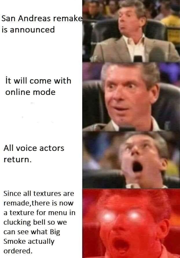 در ریمستر سن آندرس، این موضوع با تصاویری که حال بازسازی شدهاند مشخص شد و در میم بالا هم میتوانید اهمیت آن را ببینید! طوری که داشتن بخش آنلاین و بالا بردن گرافیک بازی اهمیت بسیار کمتری در مقابل فهمیدن این راز بزرگ بیگ اسموک داشتهاند!