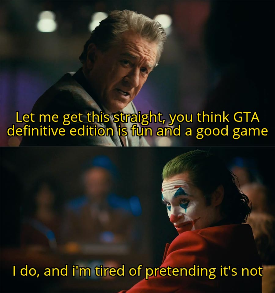 در این عکس به شخصیت جوکر (Joker) گفته شده که «آیا فکر میکنی ریمستر بازیهای GTA قشنگ هستند؟»، او نیز در پاسخ اظهار کرده که «بله، و واقعا از تظاهر به بد بودن آنها خسته شدهام!»
