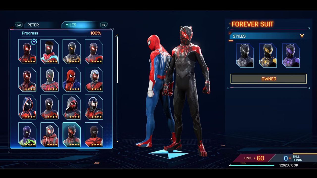 لباس Forever Suit الهام گرفته از شخصیت بلک پنتر (Black Panther) از دنیای مارول است که توسط چدویک بازمن (Chadwick Boseman) فقید به شهرت رسید. این بازی به طور کلی در بخشهای زیادی به بلک پنتر و بازمن ادای احترام کرده و یکی از آنها لباسی برگرفته از لباس بلک پنتر است که میتوانید برای مایلز بازگشایی کنید. بدون شک این لباس یکی از بهترین لباس های مایلز در Spider-Man 2است.