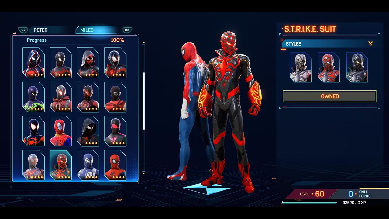 این لباس اشاراتی مستقیم به لباس Iron Spider پیتر دارد، اما واقعا زیباتر است. رنگهای مشکی و قرمز به همراه جنس متالیک نمایی بی نظیر به این لباس بخشیده و به عقیده بسیاری جز بهترین لباسهای تمام این بازی است. علاوه بر آن نباید درخشش دست و پای مایلز در این لباس را فراموش کرد که آن را چندین پله ارتقا داده است.