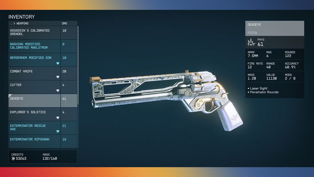 سلاح Deadeye یکی از چشم نوازترین سلاحهای استارفیلد بوده که خوشبختانه به دست آوردن آن بسیار ساده است. شما کافی است پیشنهاد مارشال بلیک (Marshall Blake) را پذیرفته و به پیش برد عملیات Deputized در شهر آکیلا بپردازید. شما در کنار این سلاح دوست داشتنی یک کلاه و لباس کلانتری نیز دریافت میکنید.