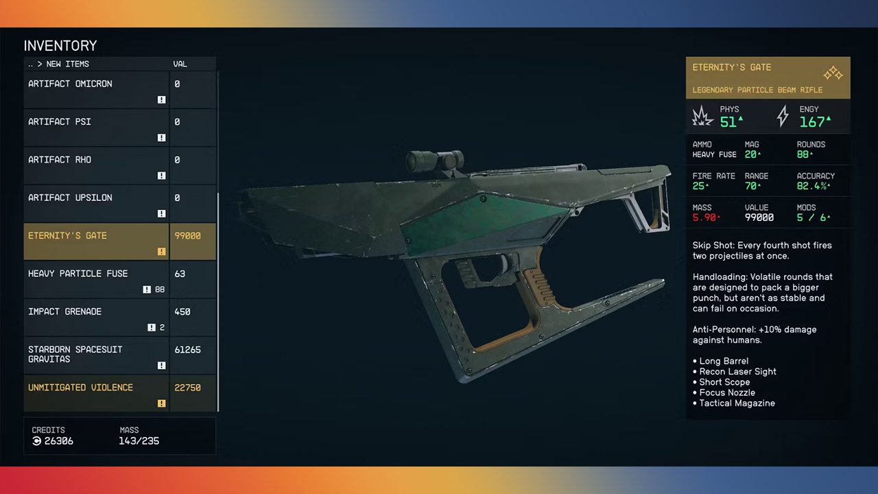 به اولین سلاح Legendary فهرست خود میرسیم. سلاح Eternity’s Gate یکی از قویترین سلاحهای بازی استارفیلد بوده که در دسته سلاحهای Particle Beam Rifle قرار دارد. به عقیده عموم کاربران سلاح Eternity’s Gate بهترین اسلحه Starfield است. همچنین باید اشاره داشت که این سلاح گرانترین سلاح بازی است. شما میتوانید این سلاح را پس از شکست دادن امیسری (Emissary) در منطقه Buried Temple دریافت کنید. البته نباید فراموش کرد که رسیدن به امیسری تنها از طریق پیمان بستن با هانتر یا پیمان بستن با هیچ یک از افراد طی عملیات Unearthed، از جمله عملیات خط داستانی اصلی بازی، قابل انجام است.