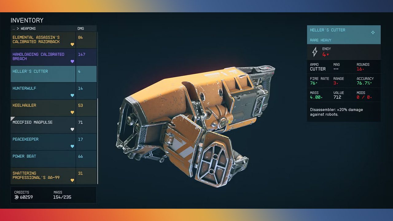 سلاح Heller’s Cutter یکی از سلاحهایی است که به سادگی به دست میآید. این سلاح در قمر وکترا (Vectera)، قمری که بازی استارفیلد در آن آغاز میشود قابل دریافت است. البته شما در بازدید اول نمیتوانید این سلاح را به دست آورید. اما شما میتوانید با بازگشت به این قمر در سیستم ناریون (Narion) به این سلاح که در یک جعبه قرار داشته دسترسی پیدا کنید.