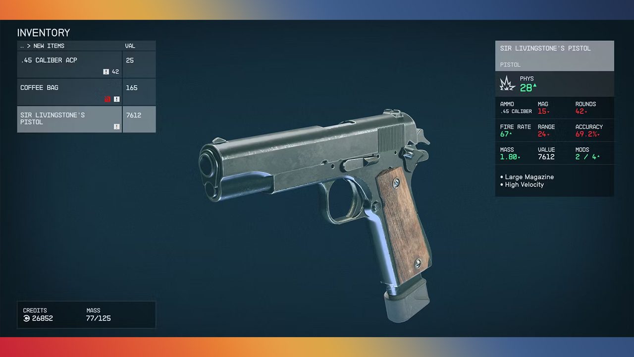 سلاح Sir Livingstone’s Pistol به هیچ عنوان در دسته بهترین اسلحه Starfield جای نمیگیرد، اما ارزش بالای این تفنگ آن را با اهمیت کرده است. شما برای به دست آوردن این سلاح باید در ابتدای بازی ویژگی Kid’s Stuff را برای خود برگزینید. پس از آن به شهر نیو آتلانتیس و سپس منطقه Residential District رفته تا پدر و مادر خود را ملاقات کنید. پس از ملاقات، پدر شما این پیستول قدیمی و دوست داشتنی را به شما هدیه میدهد.