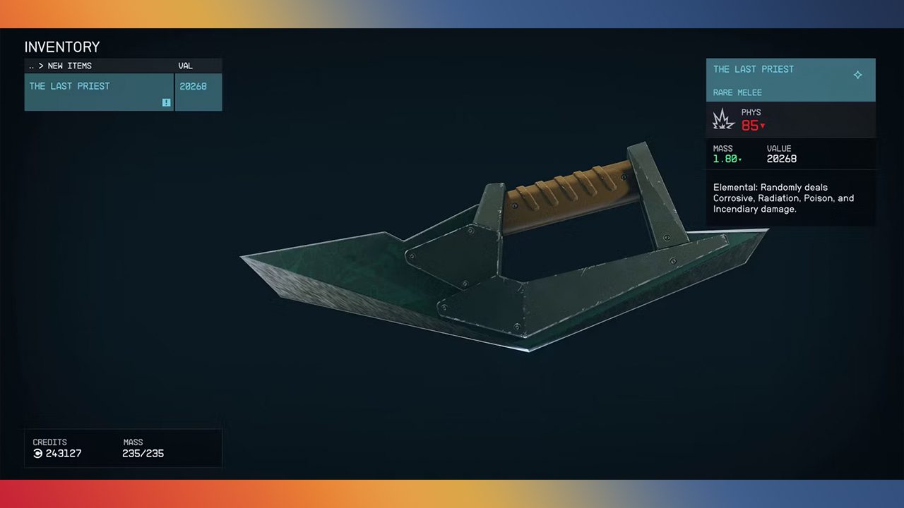 به اولین سلاح سرد فهرست بلند بالای خود یعنی سلاح The Last Priest میرسیم. شما برای به دست آوردن این سلاح سرد باید به تکمیل یکی از عملیات فرعی بازی استارفیلد، یعنی عملیات Infinity’s End بپردازید که تنها از طریق مکالمه با هانتر در پایان عملیات Unearthed، که از جمله عملیات خط داستانی اصلی بازی بوده، قابل دسترسی است.