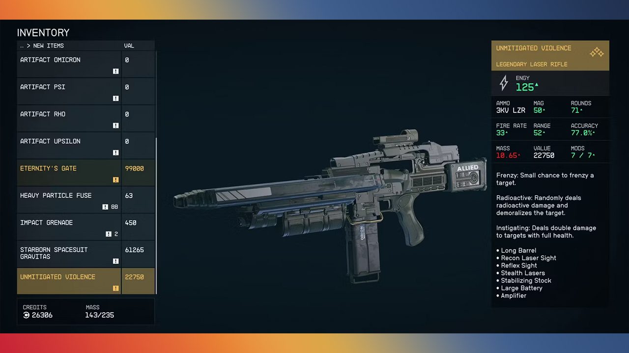 سلاح لیزری Unmitigated Violence سلاح اصلی هانتر است و تعجبی ندارد که این سلاح یکی از بهترین سلاحهای تمام بازی استارفیلد باشد. شما میتوانید این سلاح Legendary را با از بین هانتر در Buried Temple به دست آورید. فراموش نکنید که در صورت پیمان بستن با هانتر، این گزینه از شما گرفته شده و سلاح را از دست میدهید. در صورتی که شما به دنبال این سلاح هستید، باید در پایان عملیات Unearthed که یکی از عملیات مهم خط داستانی اصلی بازی بوده با امیسری یا هیچ یک از میان امیسری و هانتر پیمان ببندید!