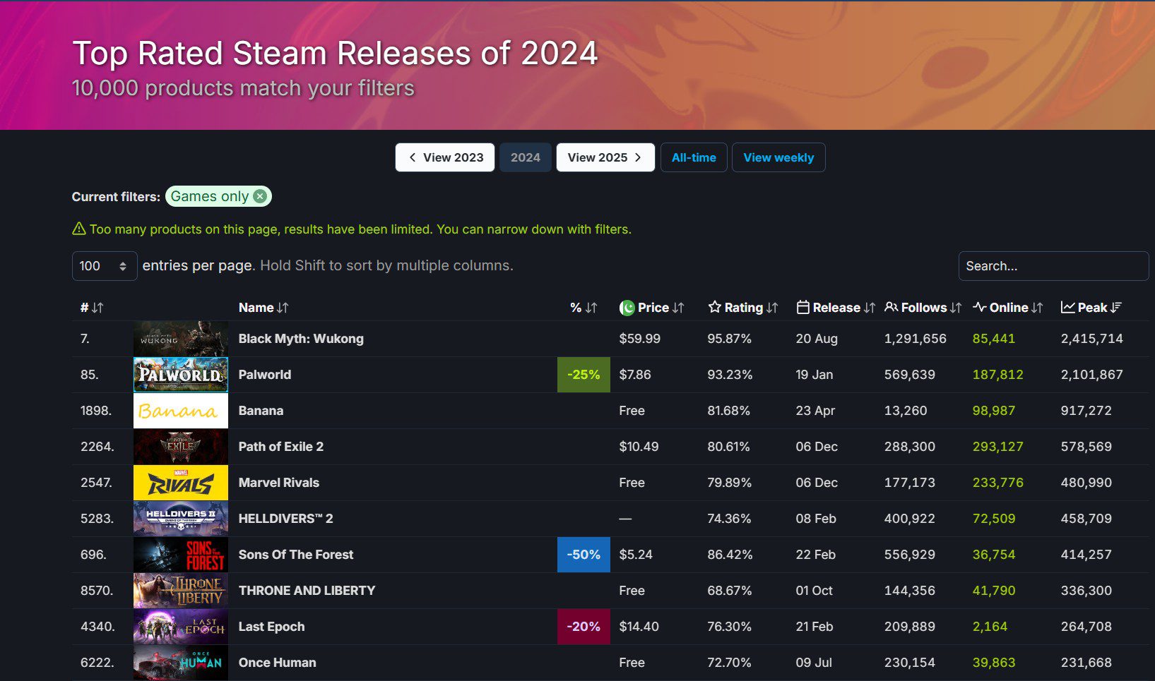بر این اساس، ردهبندی این جدول بر اساس بازخوردها و همچنین تعداد بازیکنها بوده که بدین ترتیب، بلک میث ووکونگ در صدر آن به چشم میخورد. البته، باید در نظر داشت که فارغ از این عنوان، هیچ کدام یک از بازیهای سال ۲۰۲۴ میلادی نتوانستهاند به چنین جامعه بزرگی دست پیدا کنند.