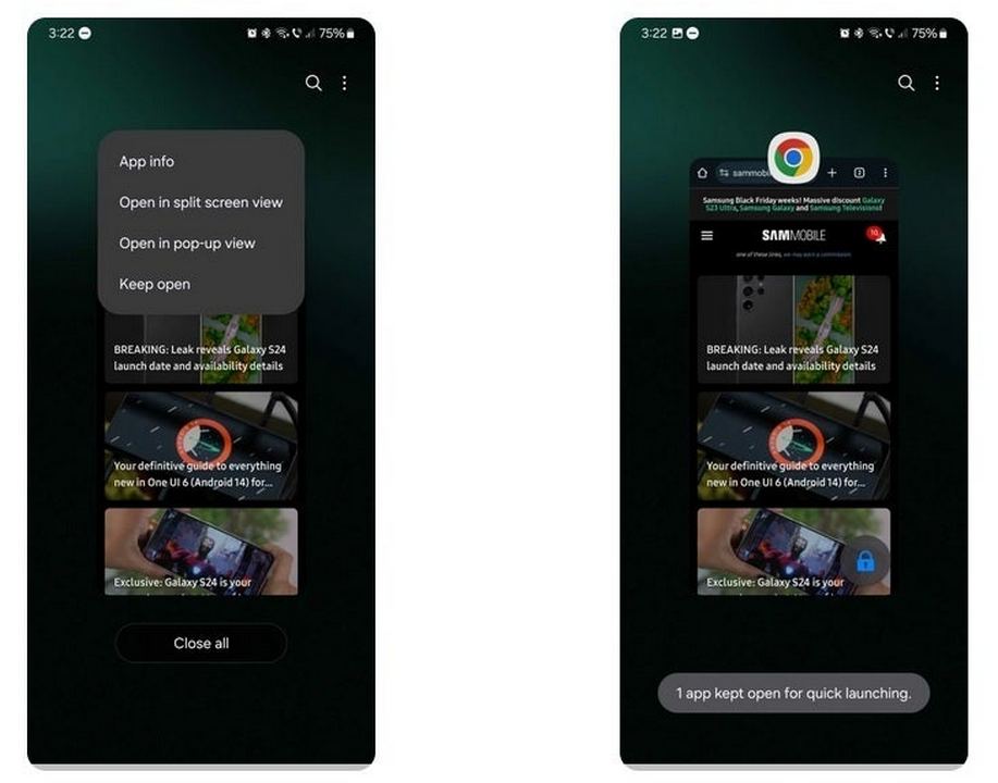 در رابط کاربری جذاب سامسونگ شما کافی است منوی برنامههای اخیر را با فشردن کلید دیجیتالی سمت چپ باز کنید و روی آیکون اپلیکیشن مورد نظر در بالای پنجره کلیک کنید. در بین گزینهها، Keep open را انتخاب کنید. با انتخاب این گزینه، پیامی به نمایش در میآید مبنی بر اینکه برنامهی یادشده باز میماند تا برای دفعات بعد بتوانید سریعتر آن را اجرا کنید. یک آیکون قفل هم در سمت راست-پایین صفحه به نمایش در میآید تا نشان دهد این اپ قفل شده است.