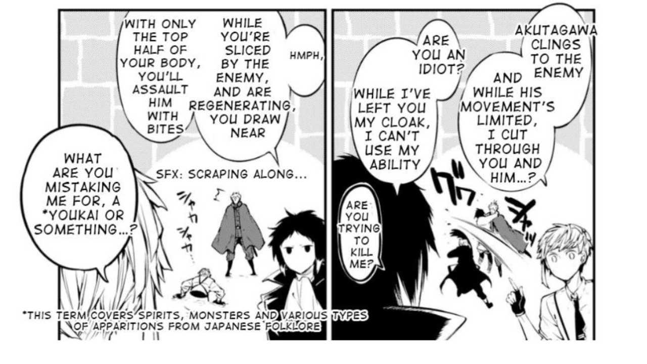 - علاوه بر اینکه آکوتاگاوا و آتسوشی در مانگا به صورت دقیقتری استراتژیشان را برنامهریزی میکنند، در مانگا یک صفحه از این دو نیز وجود دارد که در آن به این فکر میکنند که دازای (Dazai) نابغه و چویای (Chuya) قدرتمند در این موقعیت چه کاری انجام میدادند.