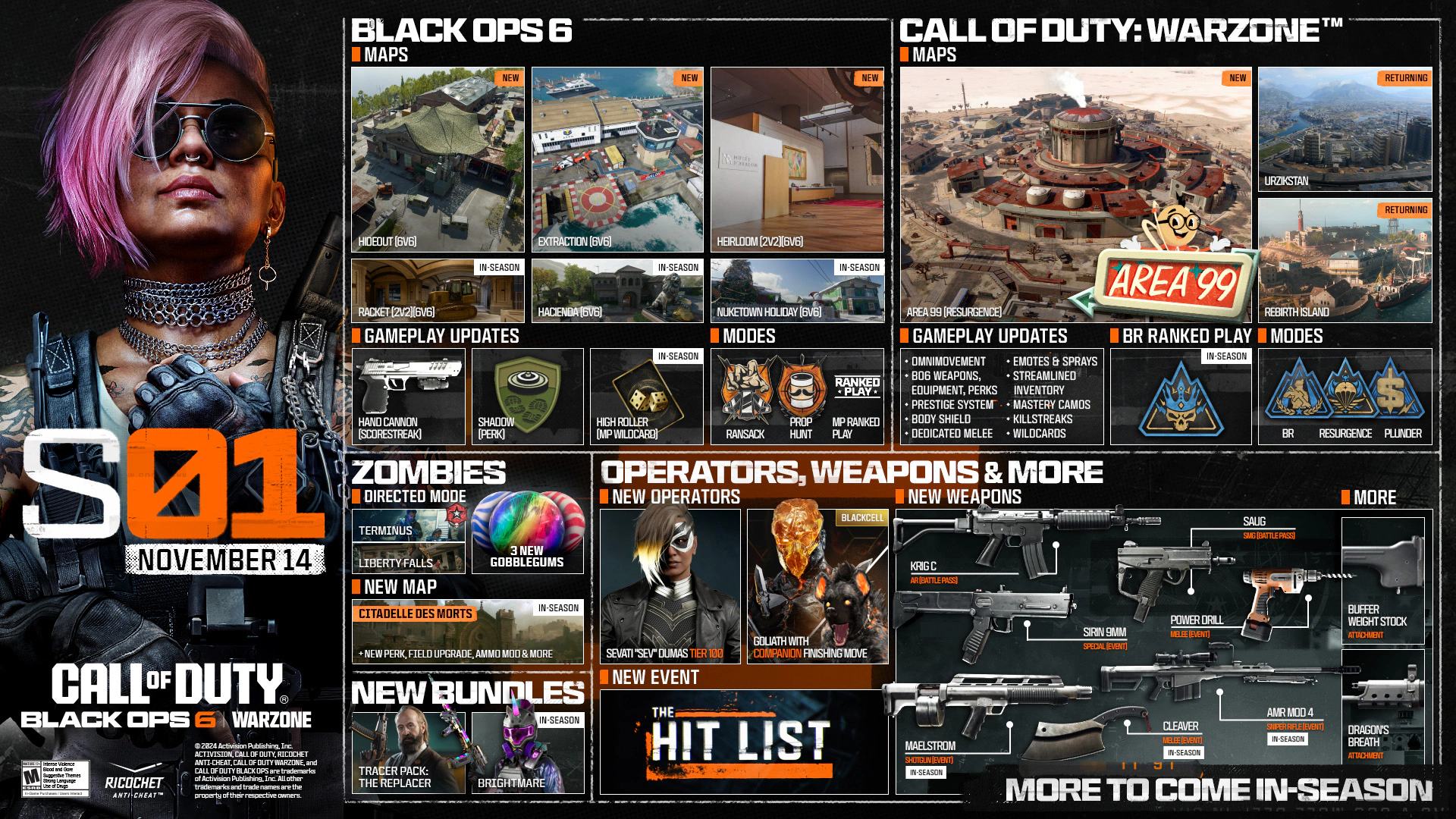 همانطور که شرکت اکتیویژن وعده داده بود، ساعاتی پیش استودیو تریآرک از محتوای فصل اول بازی کالاف دیوتی بلک اپس ۶ و وارزون رونمایی کرد که طبق روال همیشه، در جریان این فصل محتواهای جدیدی از نقشهها گرفته تا حالتهای چندنفره، سلاح، تجهیزات، اپراتور تازه در دسترس گیمرها قرار میگیرد. این فصل از تاریخ ۱۴ نوامبر سال جاری (۲۴ آبان پیشرو) آغاز خواهد شد.