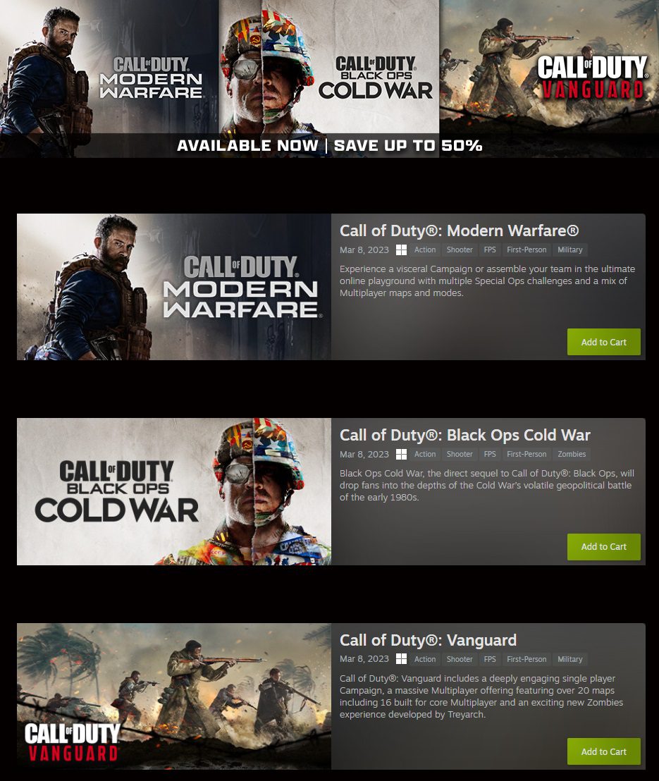 شرکت اکتیویژن در اقدامی غیرمنتظره سه بازی اخیر سری کالاف دیوتی را با تخفیف ۵۰ درصدی در فروشگاه استیم منتشر کرد.