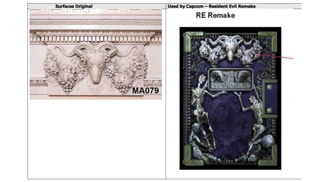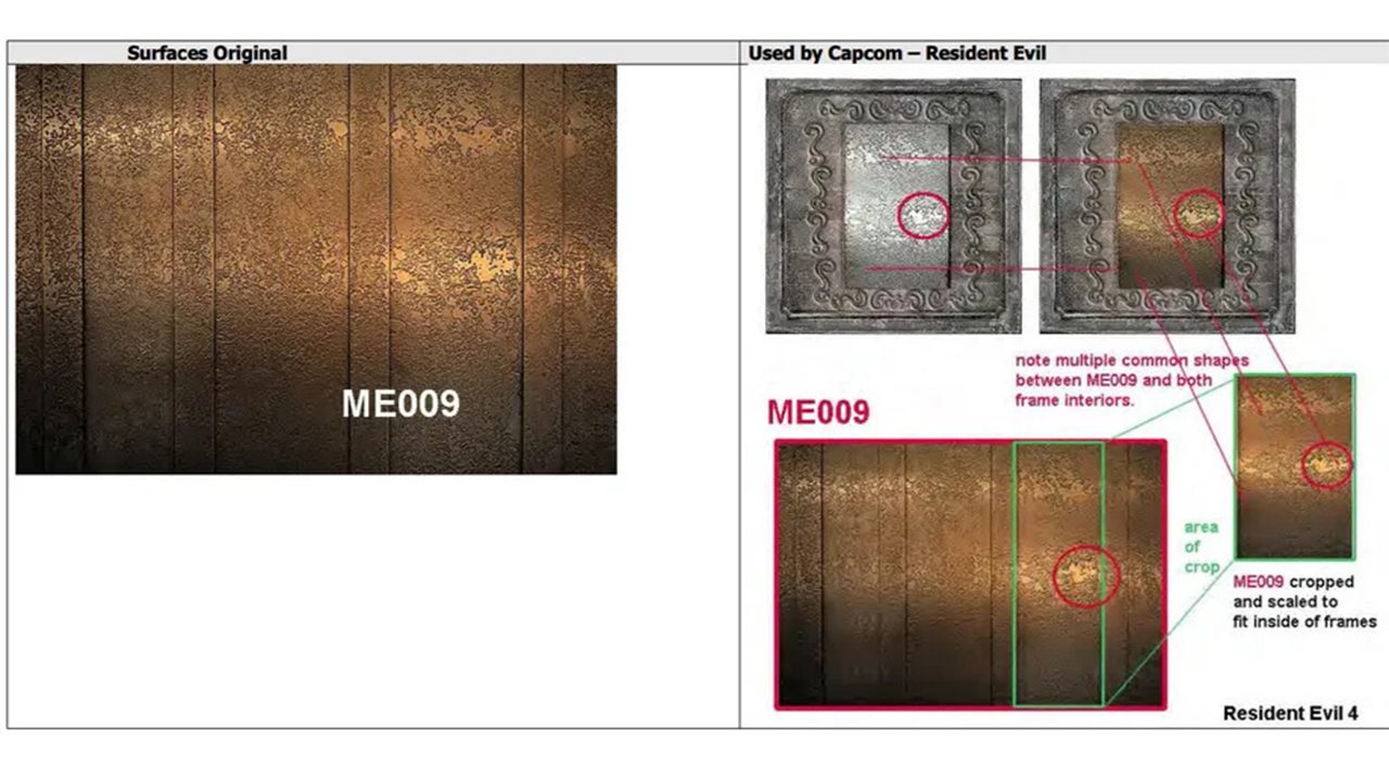 شکایت وضع شده شامل عکسی از سطحی فلزی در دیسک کتاب Surfaces با نام «ME009» بود که در فایلهای لو رفته از کپکام نیز این عکس عینا با همین نام مشاهده شده است. در این شکایت همچنین مطرح شده که مدتی پیش شرکت کپکام به کپی برداری بدون اجازه از فیلم کارگردان هلندی یعنی آقای ریچاد راپهورست (Richard Raaphorst) در بازی Resident Evil Village متهم شده است. راپهورست مدتی پیش طی مصاحبه با Eurogamer اعلام کرد او نیز پس از ارتباط با برخی طرفداران متوجه شده که کپکام از شخصیتهای فیلم Frankenstein’s Army او بدون اجازه کپی برداری کرده است و یکی از نمونههای کپی برداری شده به هیولایی که سرش از پروانه ملخی هواپیما تشکیل شده و نامش Sturm است اشاره دارد.