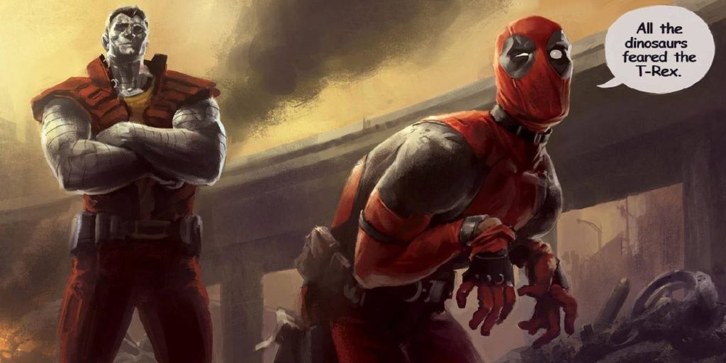 حال تصویری که راب لایفلد در توییتر خود منتشر کرده، دقیقا همان صحنهی روی پل را نشان میدهد که دستان ددپول در اثر ضربه به بدن محکم کلوسوس شکسته و دیالوگ «تمام دایناسورها از تیرکس میترسند» را به تصویر کشیده است.