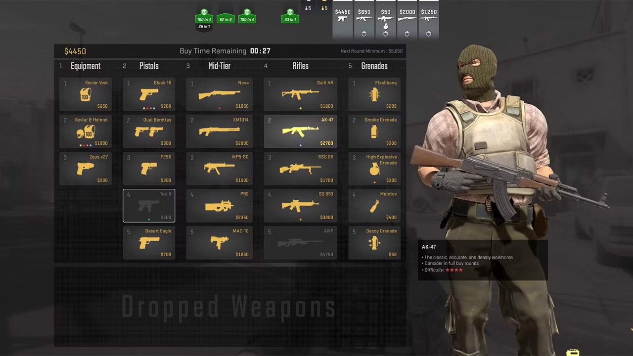 پس از جمع آوری میزان پول مورد نظر، ابتدا به خرید ضروریات، یعنی سلاح اصلی روی آورده و سپس به خرید دیگر تجهیزات بپردازید. مدیریت درست پول در ابتدای بازی میتواند پیروزی شما را تضمین کند. اقتصاد در این بازی روندی دومینو وار دارد.