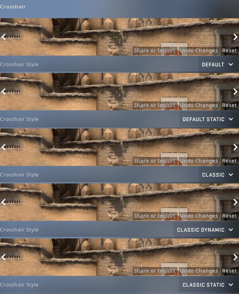 در بازیهای تیراندازی اول شخص، علامتی که در وسط تصویر برای نشانهگیری قرار میگیرد به انگلیسی Crosshair نام دارد. شما میتوانید در بازی CS:GO این علامت را شخصیسازی کنید. برای این کار، باید به بخش تنظیمات بروید و در بخش Game قسمت Crosshair را انتخاب کنید. در این بخش هر تغییری که در علامت لحاظ کنید، به طور پیشفرض نشان داده میشود. علامت نشانهگیری به طور پنج حالت مختلف دارد که میتوانید در پایین آنها را ببینید. تفاوت اصلی این موارد به جز رنگ و نوع خط آنها، در تنظیماتشان است.