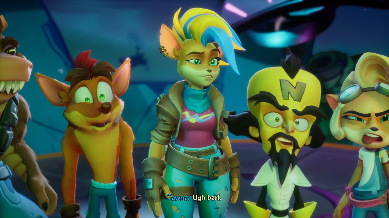 علاوه بر تمام اینها، میتوان گفت که شخصیتپردازی تک تک کاراکترها، در بازی Crash Bandicoot 4 عمق بیشتری پیدا کرده و به لطف همین مراحل اضافی یا به نوعی فرعی، میتوانید بیشتر با شخصیتهای دنیای کرش بندیکوت آشنا شوید. از طرفی دیگر هم، وجود کاتسینها و سینماتیکهای بیشتر در کنار دیالوگهای پختهتر، به طور کلی روایت داستانی و معقولهی شخصیتپردازی را در این آیپی ارتقا داده است. حالا بندیکوتها و حتی دشمنانشان، از هر زمان دیگری، دوستداشتنیتر هستند.